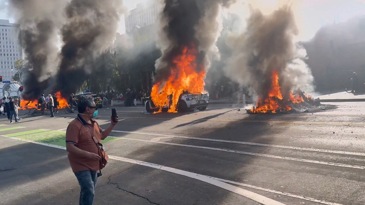 A indignação popular se materializou em milhares de pessoas ocupando o centro de Los Angeles, com foco nas imediações da Freeway 101. Edifícios públicos foram pichados, carros – incluindo os da empresa Waymo , que operam táxis autônomos – foram incendiados e o tráfego ficou completamente paralisado em alguns trechos.