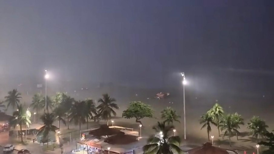Chuvas fortes, ventos e tempestade de raios atingem a região da Baixada Santista, em São Paulo, na noite desta quinta-feira (01). Defesa Civil emitiu alerta severo para população e municípios vizinhos.