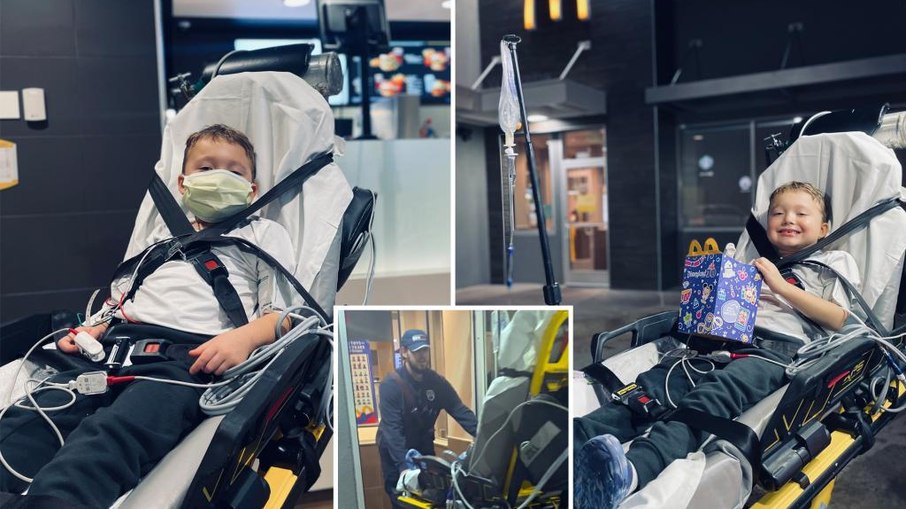 Uma equipe de paramédicos fez uma parada inusitada durante o transporte de um paciente pediátrico em Oklahoma, nos Estados Unidos. O menino Jaxon McGee, de 6 anos, estava sendo transferido de um hospital em Norman para o OU Health University of Oklahoma Medical Center, em Oklahoma City, nos Estados Unidos, quando pediu para passar por uma unidade do McDonald’s . Após autorização médica, o pedido foi atendido. A informação é do NY Post.