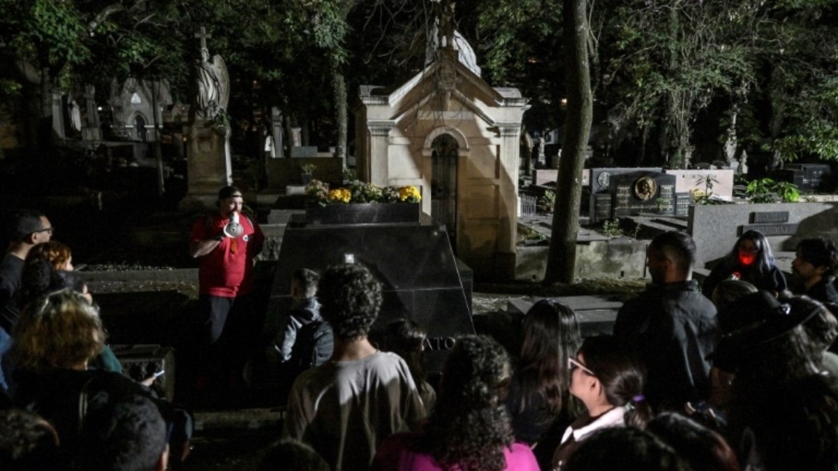 Em uma escuridão praticamente absoluta, quebrada apelas pela luz dos celulares dos visitantes, lanternas e as luzes dos prédios ao redor, o tour relembra a vida de personalidades que estão enterradas no cemitério.