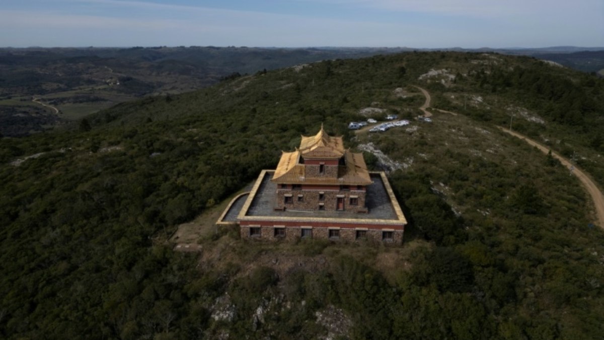 Uma massa de pedra, telhados dourados e uma fachada ornamentada desafiam os ventos de forma imponente. Parece coroar um canto do Himalaia, mas é um templo budista tibetano escondido nas montanhas do sudeste do Uruguai.