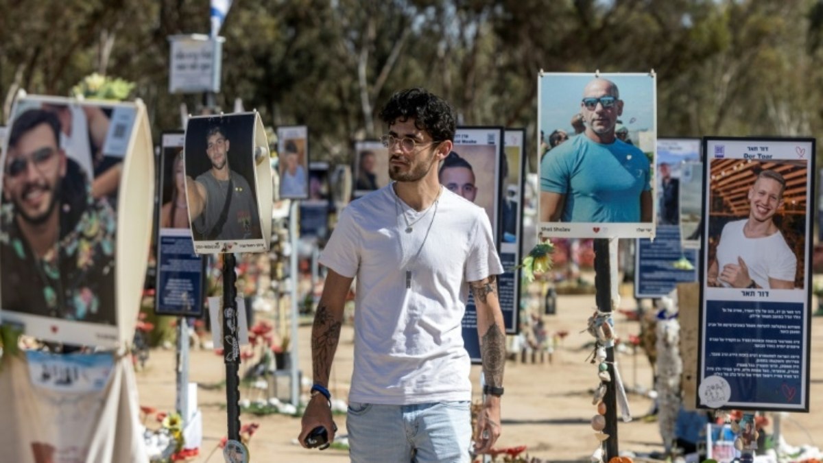 A artilharia dos combates em Gaza soa à distância enquanto Shye Klein-Weinstein caminha lentamente pelo memorial das quase 400 pessoas mortas no festival Nova, no sul de Israel, em 7 de outubro de 2023.