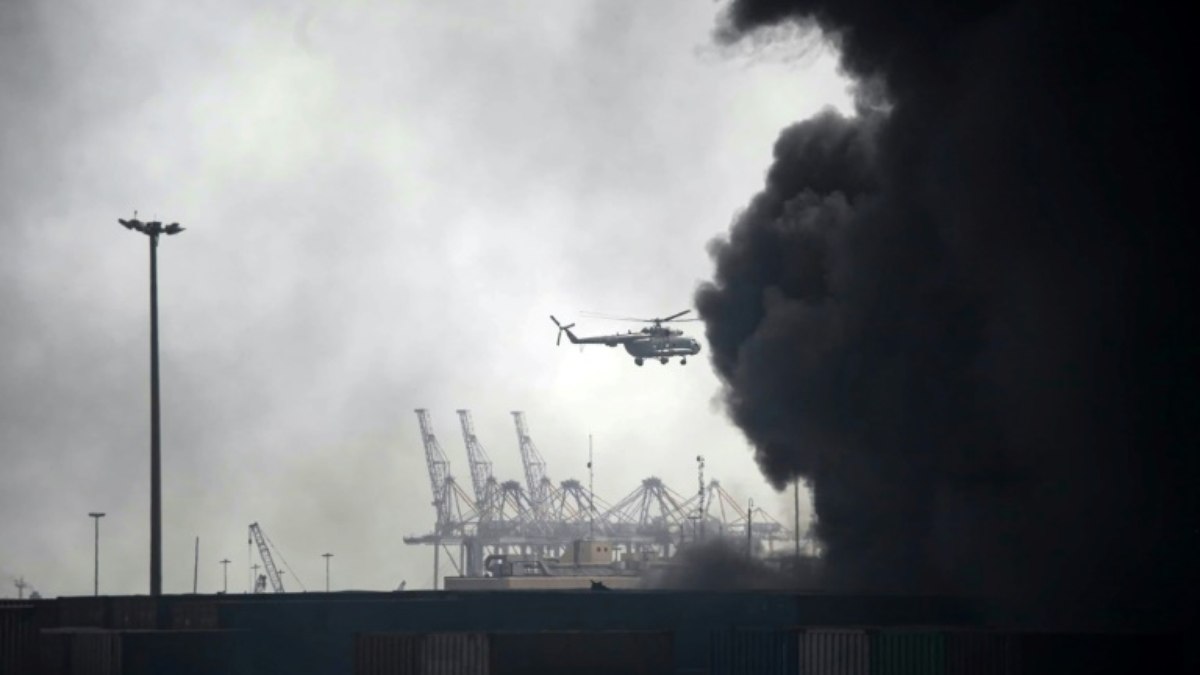 Imagens de televisão mostraram grossas nuvens de fumaça sobre a área do porto, onde há vários contêineres, com helicópteros sobrevoando para apagar as chamas.