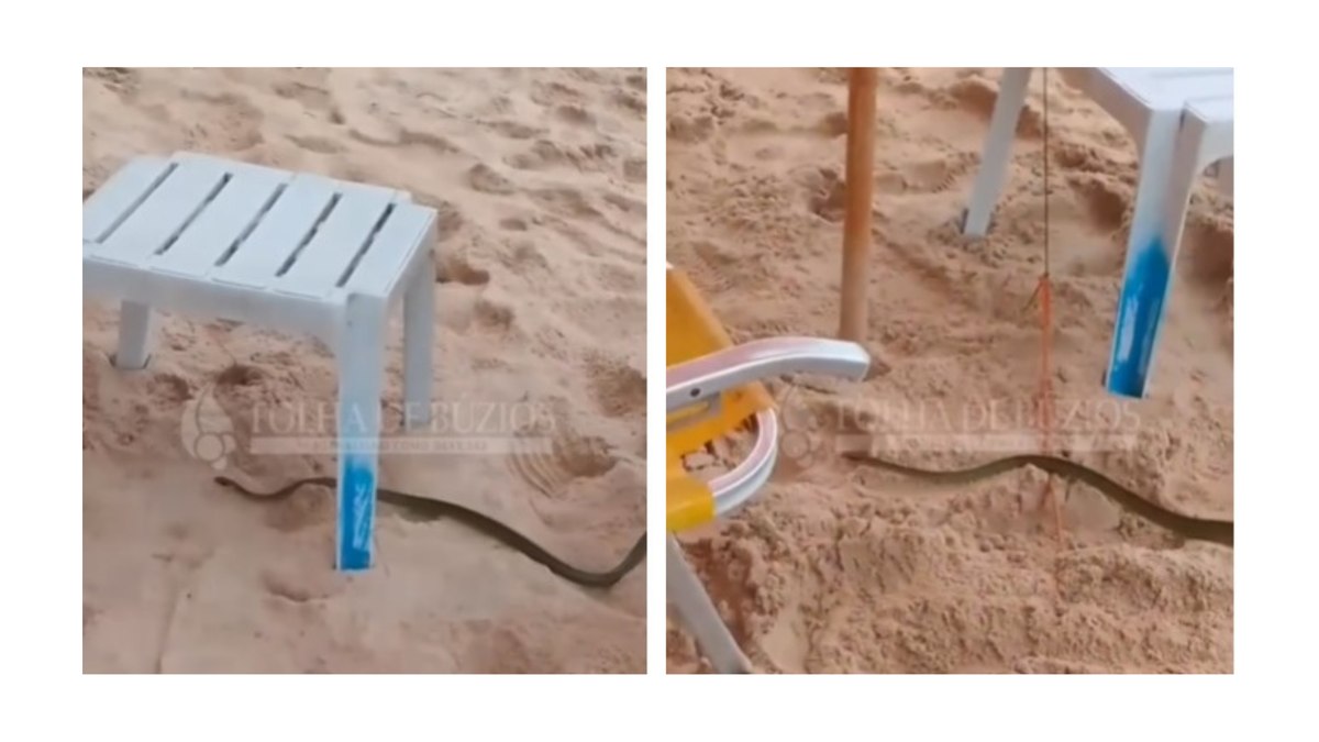 O animal deslizou entre cadeiras e mesas de praia, chegando até a subir em uma das espreguiçadeiras antes de desaparecer na vegetação próxima. A cena causou correria e deixou muitos banhistas em alerta.