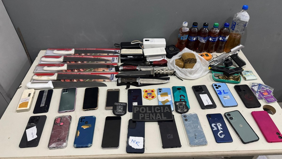 Com ele, foram apreendidos 24 celulares, 12 facas, uma arma de fogo, 11 carregadores portáteis e 500 gramas de maconha. Todo o material estava escondido em compartimentos dos equipamentos utilizados pela empresa na realização de serviços de serralheria no presídio.