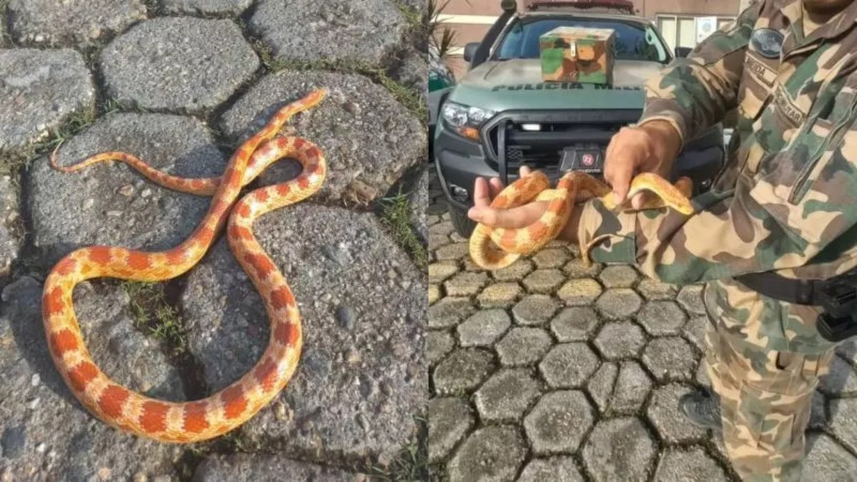 O animal é considerado inofensivo e foi identificado como uma corn snake (cobra-do-milho), espécie sem ocorrência natural no território brasileiro.