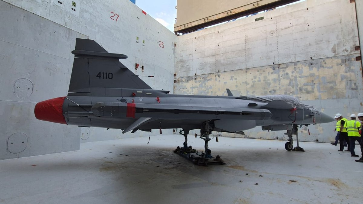O F-39 Gripen foi retirado da embarcação em uma operação meticulosa, que envolveu diferentes organizações e especialidades da Força Aérea. Seu transporte levou 20 dias, após embarque em Norrköping , na Suécia.
