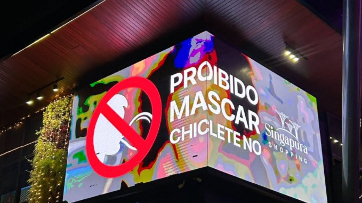 O Singapura Shopping, localizado em Caldas Novas (GO), passou a proibir os clientes de mascar chiclete dentro do centro comercial. Placas instaladas em diversas partes do empreendimento informam sobre proibição .
