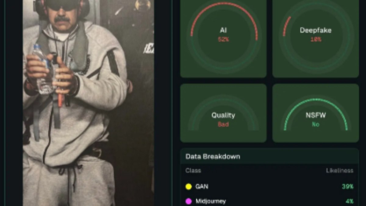 Em seguida, proliferaram fotografias do ditador sendo levado por forças militares americanas, de terno com as mãos às costas ou, ainda, vestido com pijama em um estranho avião com duas fileiras de janelas — ambas as imagens falsas. “Com base em minhas análises, toda essa imagem, ou a maior parte dela, foi criada ou editada usando o Google AI ”, apontou o chatbot do Gemini após analisar as imagens citadas. Ainda assim, centenas de milhares de pessoas as compartilharam, assim como veículos de imprensa, como o exemplo abaixo.