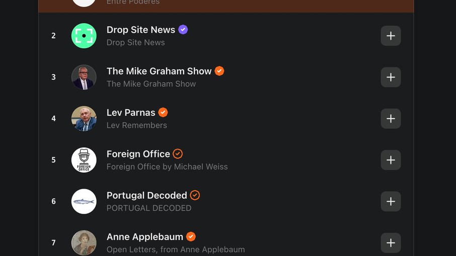 No topo da lista, a news está ao lado, por exemplo, de publicações como “The Mike Graham Show”, feita pelo famoso jornalista e comentarista britânico Mike Graham que apresentou o programa matinal Morning Glory na Talk (antiga TalkTV) e acaba de ser demitido, chamando a atenção do público; e “Drop Site News” que fica sediado em Whashington e foi fundado por Ryan Grim e Jeremy Scahill em julho de 2024 após ambos deixarem o The Intercept.