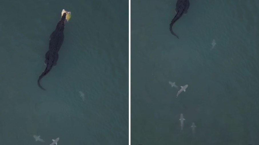 No vídeo, o crocodilo aparece segurando a tartaruga com a boca, enquanto pequenos tubarões nadam ao redor, aparentemente atraídos pelos restos do alimento e pela movimentação na água.