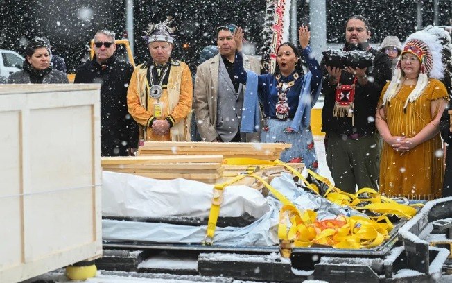 Líderes indígenas aguardaram emocionados na pista coberta de neve do Aeroporto Internacional Pierre Elliott Trudeau, em Montreal, Canadá, no sábado, enquanto um avião da Air Canada descarregava um carregamento simbólico: mais de 60 artefatos culturais preciosos que haviam sido retirados de comunidades das First Nations, dos Inuit e dos Métis há mais de um século e que, desde então, permaneciam em museus e cofres do Vaticano. As informações são da CNN.