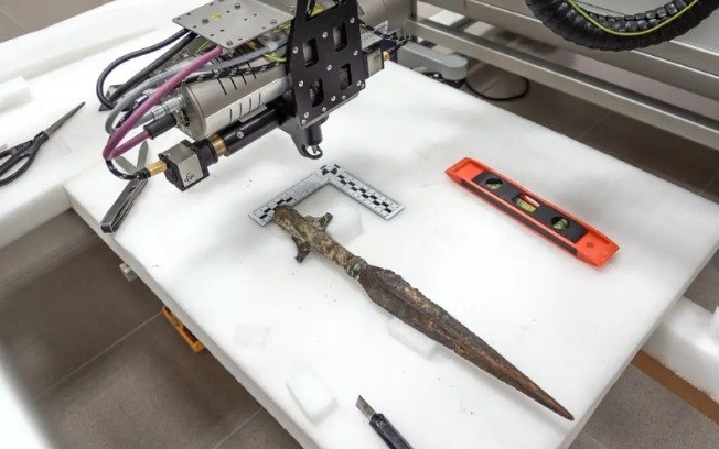 “A lâmina de aço está encaixada em um soquete ricamente ornamentado, que ainda conserva um fragmento do cabo”, disse.