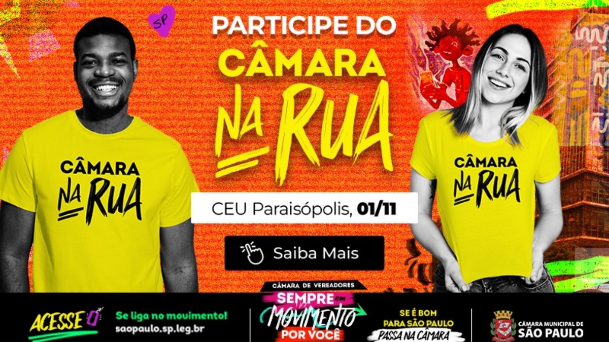 O projeto Câmara na Rua, iniciativa da Câmara Municipal de São Paulo voltada à transparência e à participação popular, realiza nova edição neste sábado (1º de novembro) no CEU Paraisópolis, a partir das 9h. O evento oferece aos moradores uma feira interativa que explica o funcionamento do Legislativo paulistano, incluindo etapas como a tramitação e aprovação de projetos de lei.