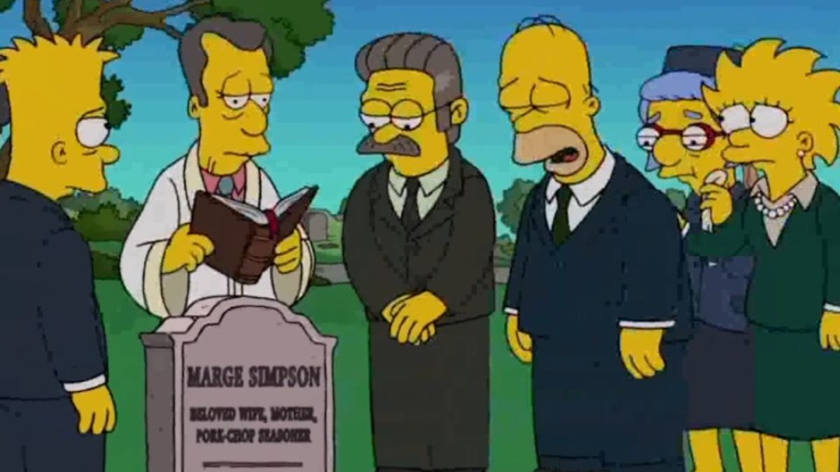 O último episódio da temporada mais recente de Simpsons trouxe uma morte inesperada, Marge a da matriarca da família é enterrada. A cena mostra amigos e toda a família com as crianças já adultas em luto durante o funeral. No céu, aparentemente ela casará com Ringo Starr .